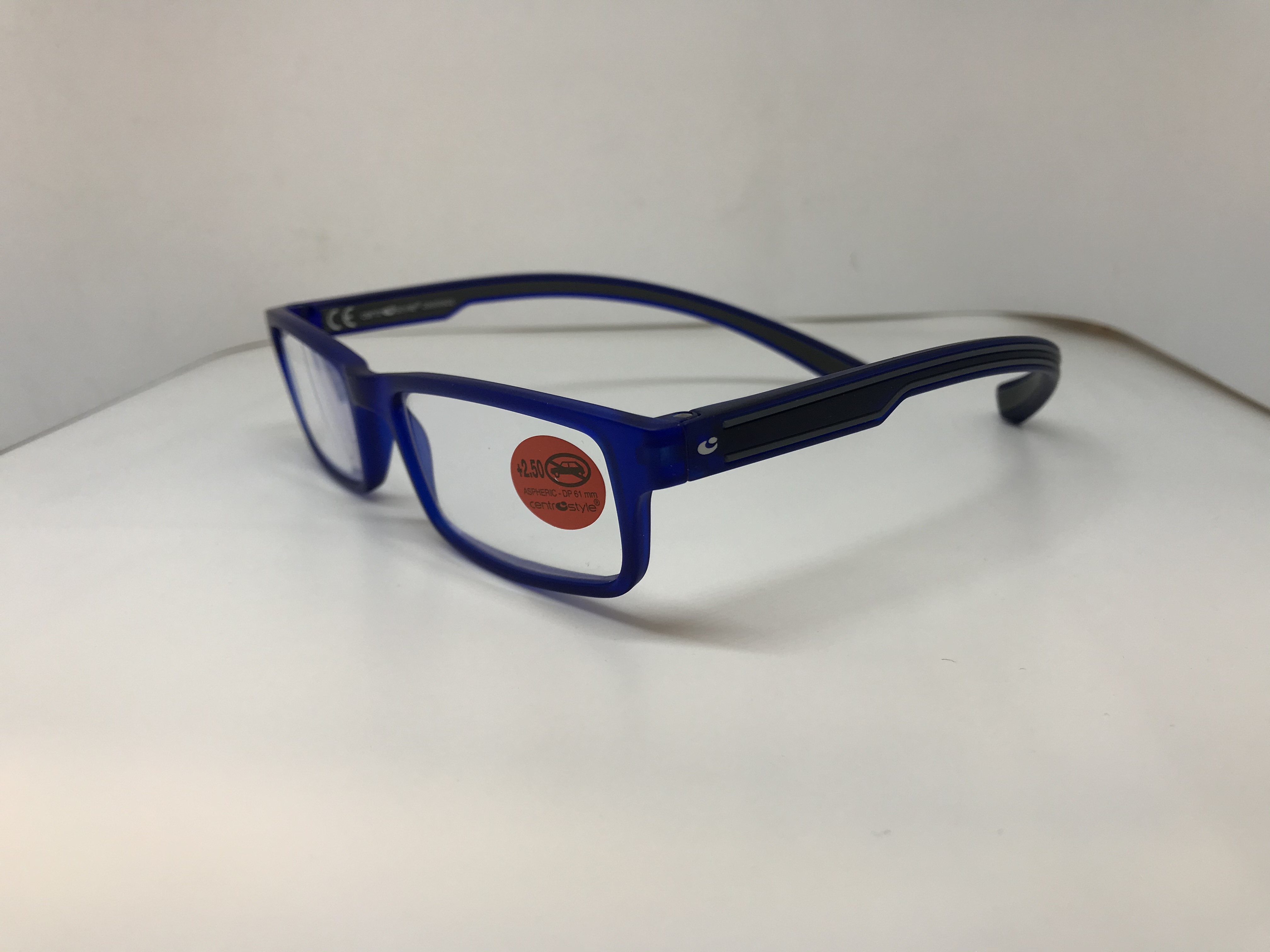Forma rettangolare, colore frontale blu opaco, aste blu scuro e grigio.