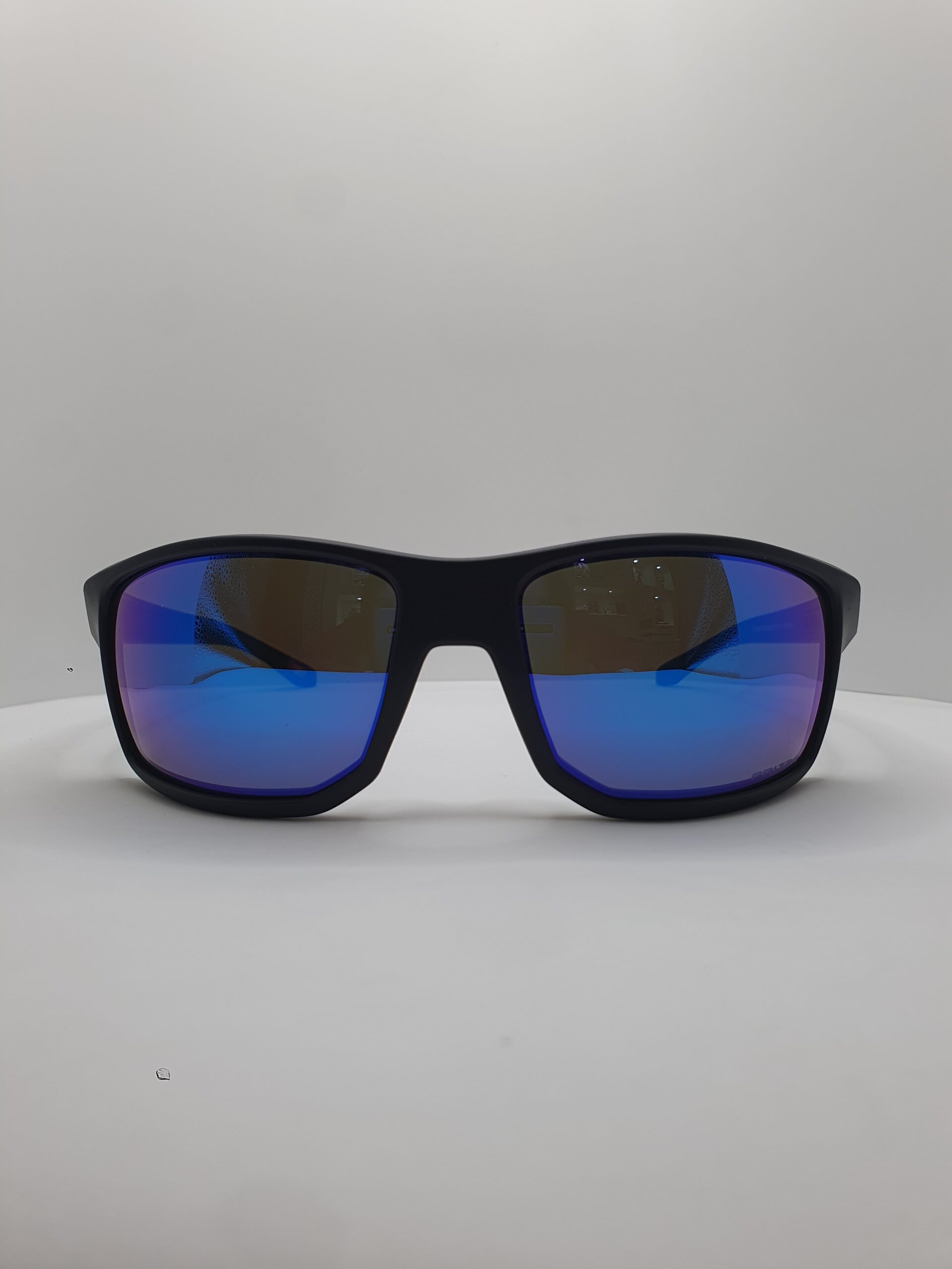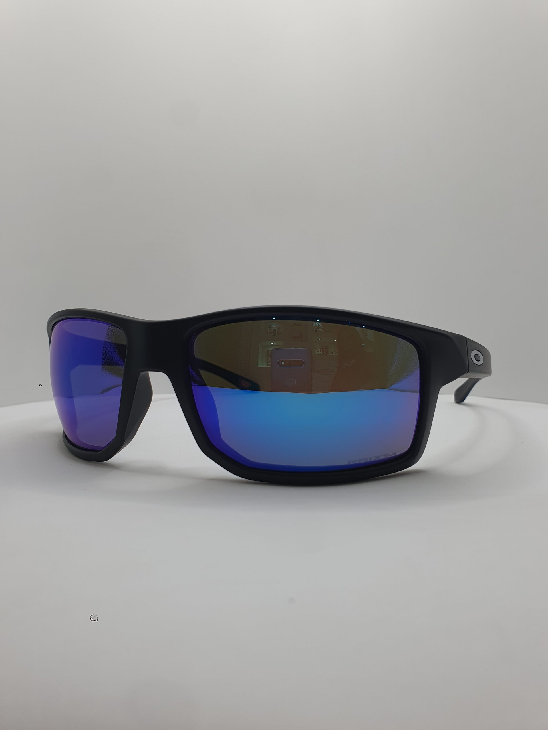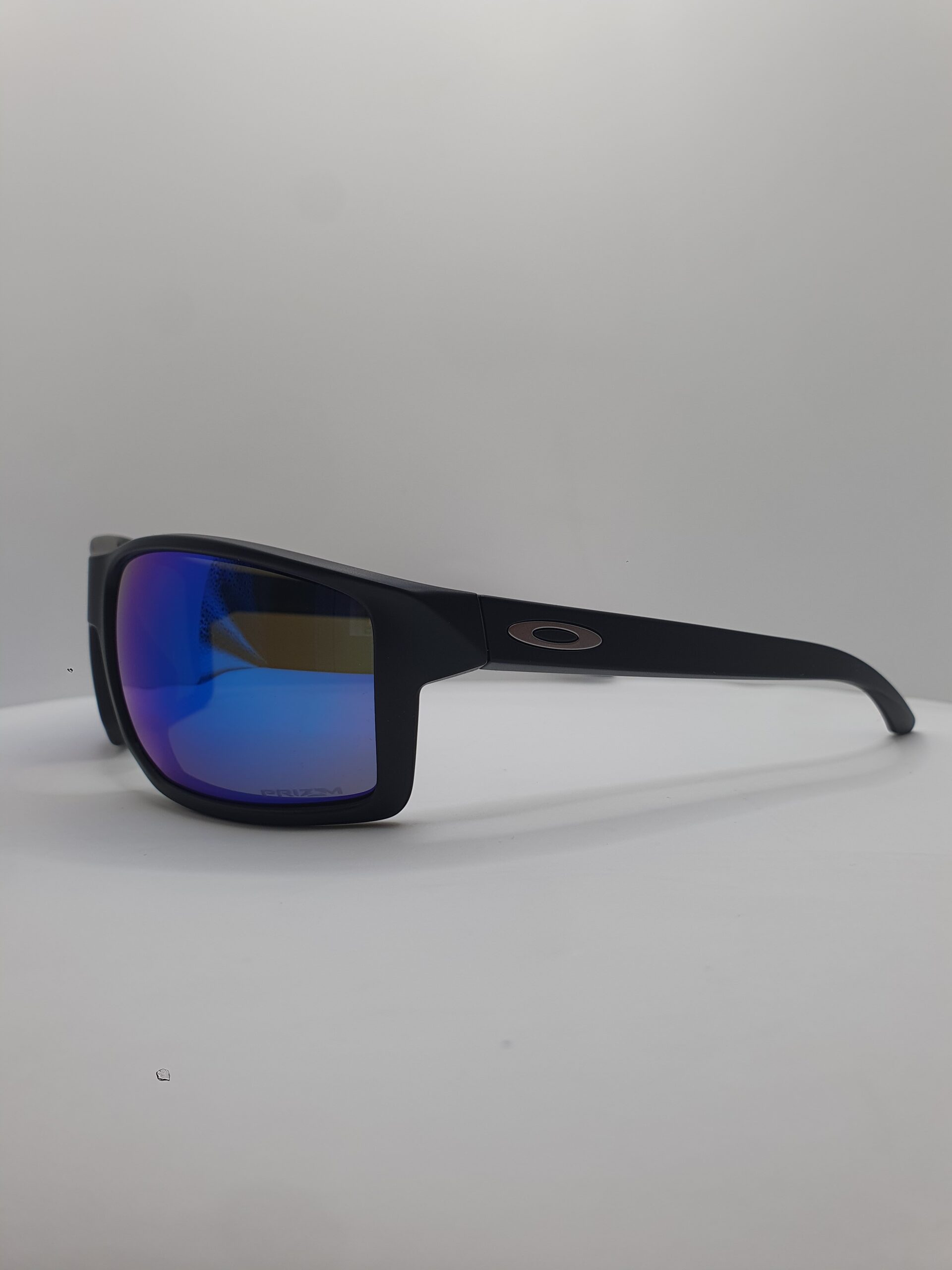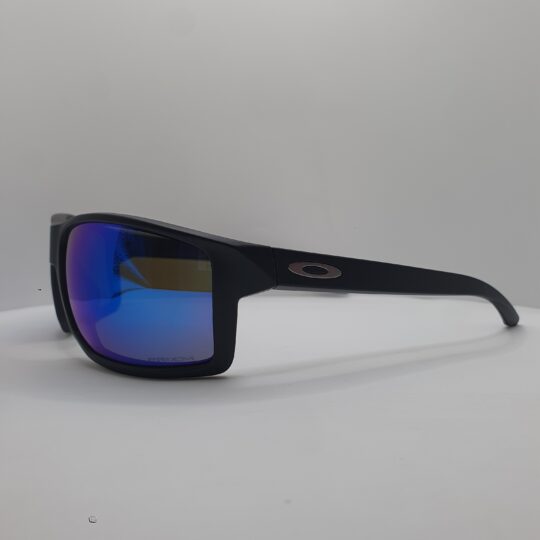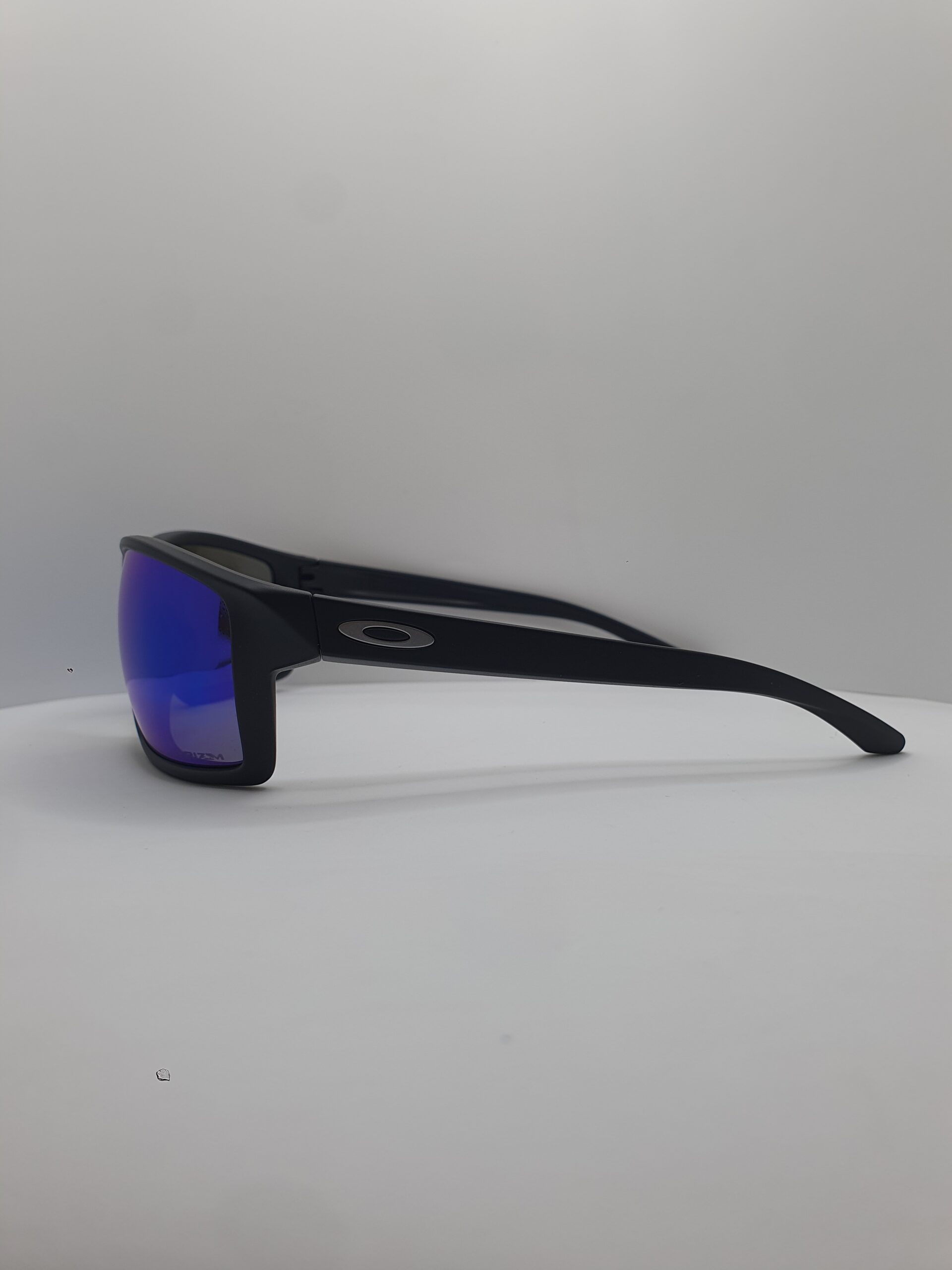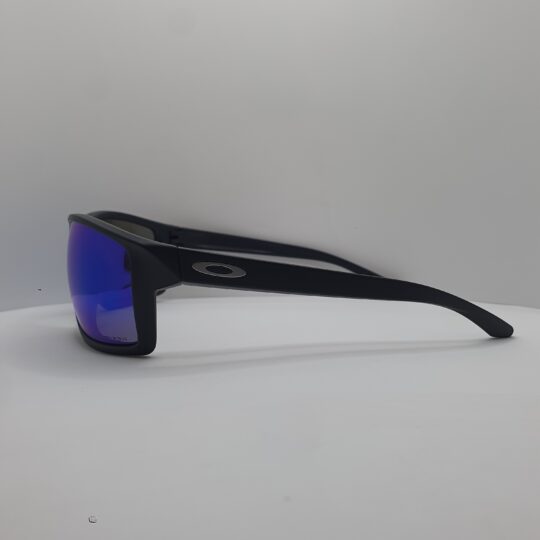 Montatura e aste nero opaco, logo oakley argento satinato, lenti prizm sapphire su base grigia.