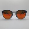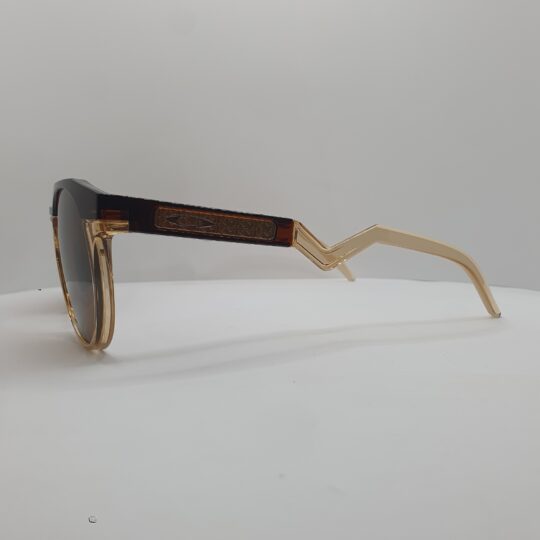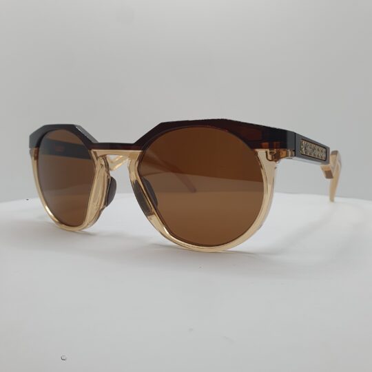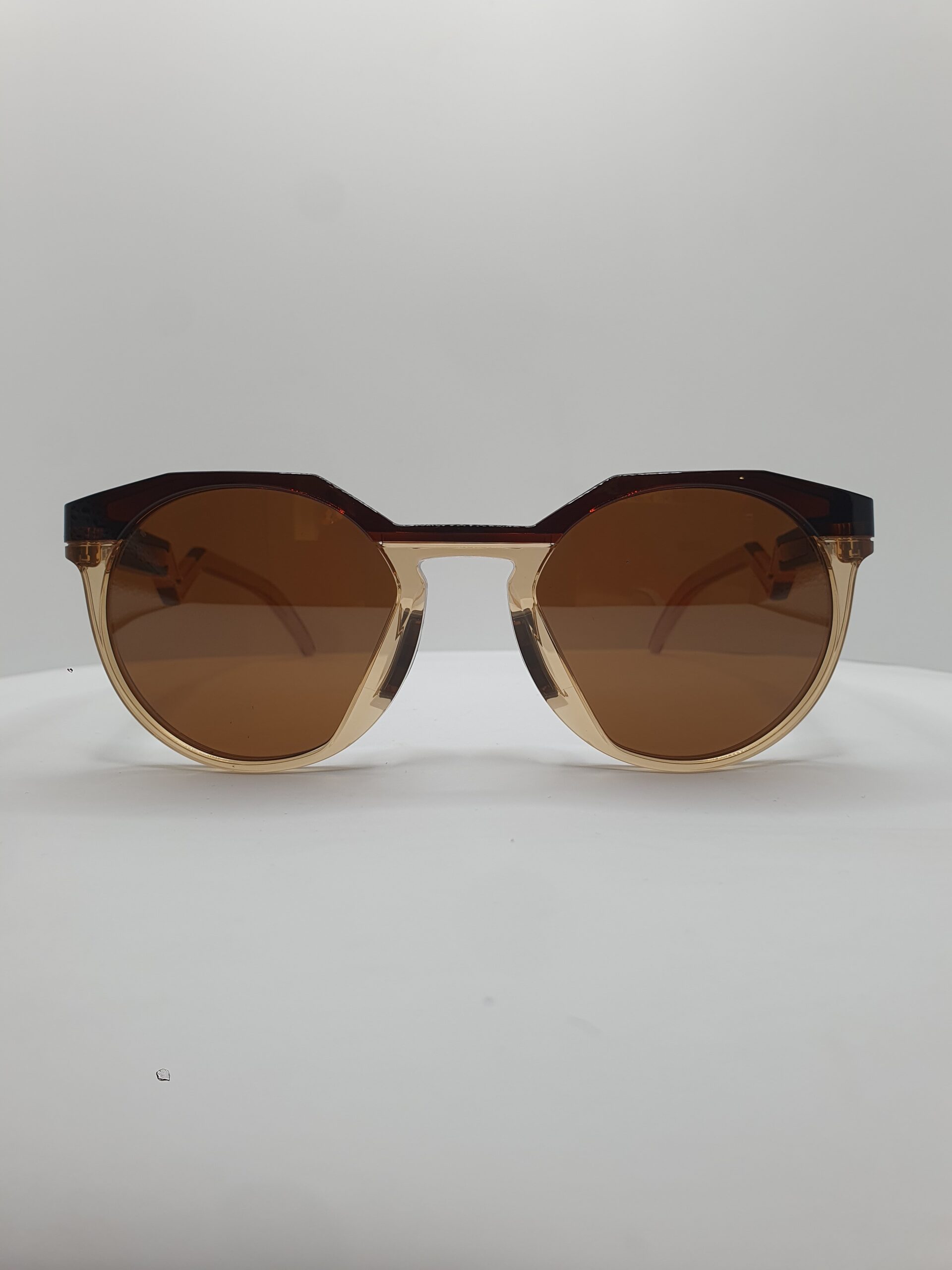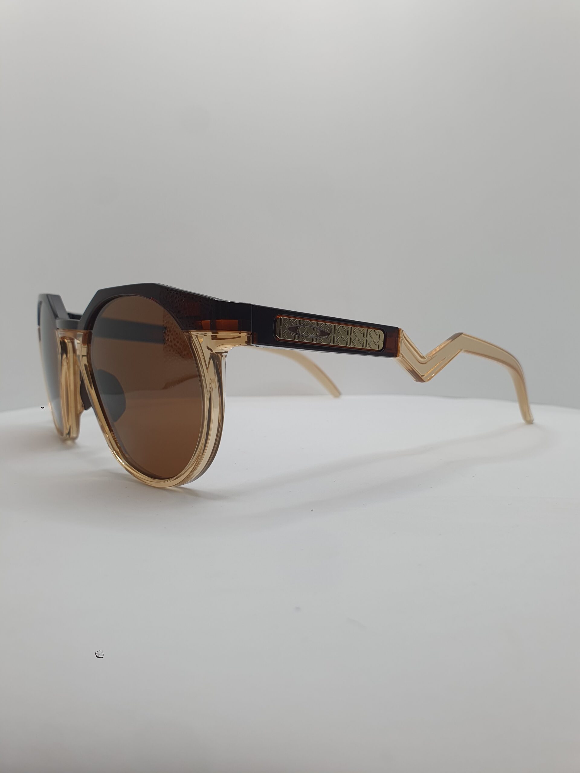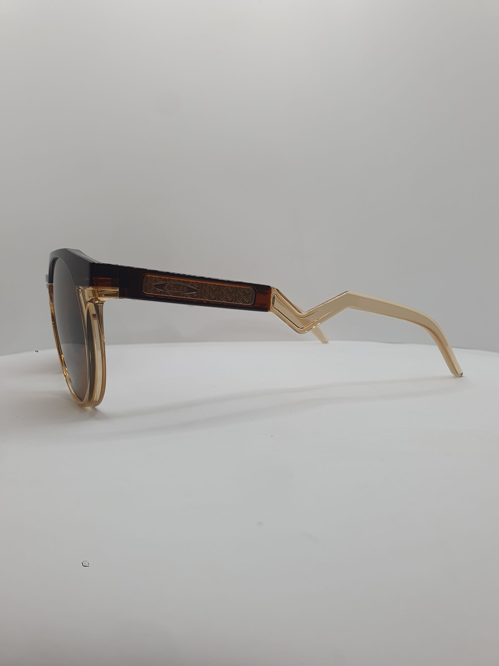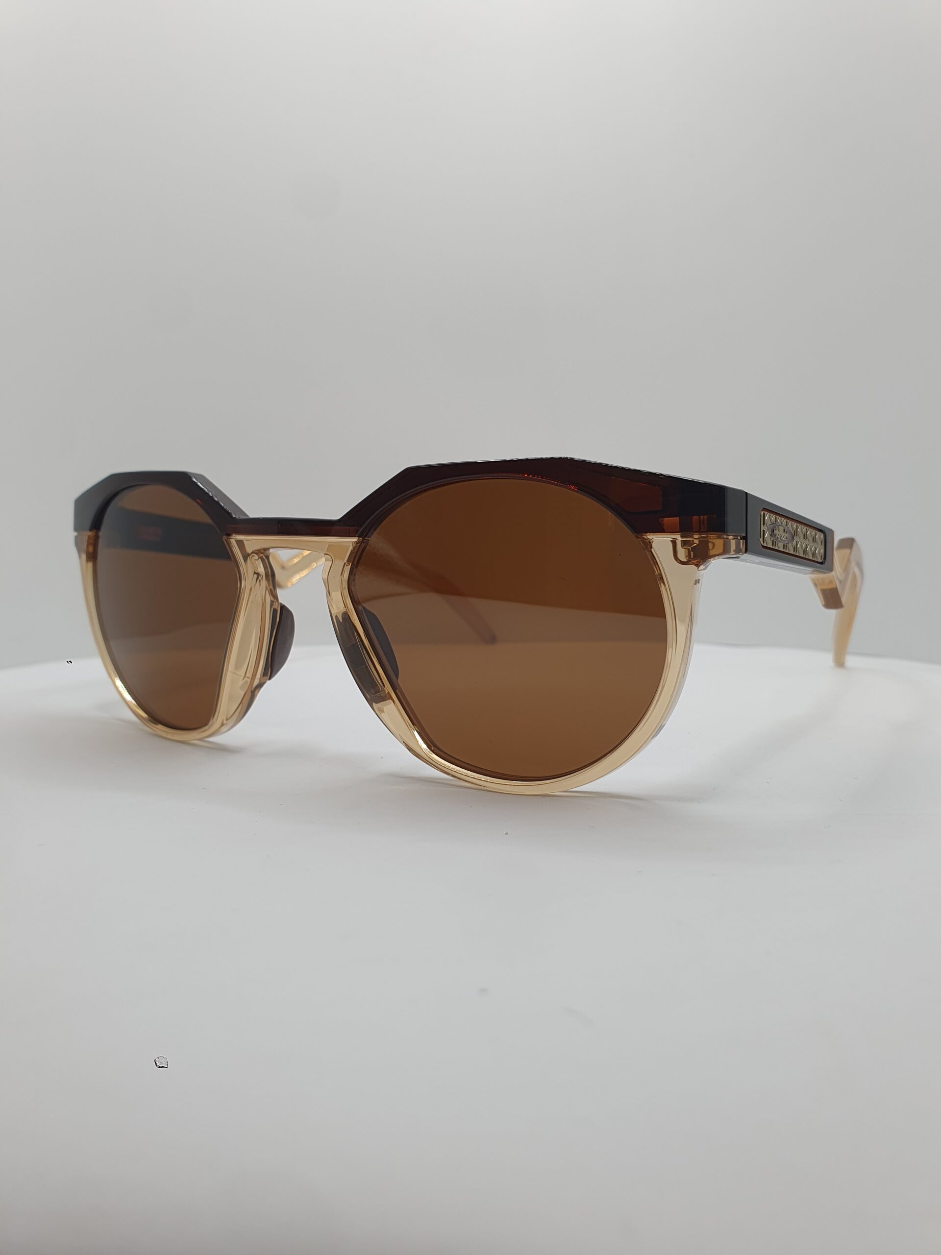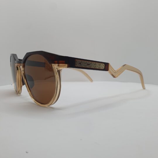 Montatura e aste ambra scuro e giallo curry chiaro lucido, logo oakley marrone chiaro su fregio decorato oro opaco, lenti prizm tungsteno marroni tinta unita.