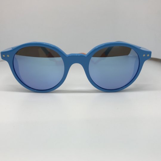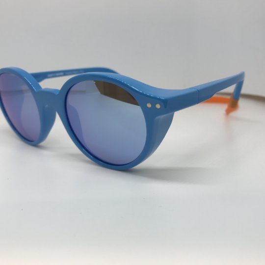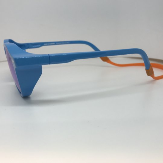 Montatura azzurro lucido con cordino in silicone staccabile arancio, lenti specchiate azzurre